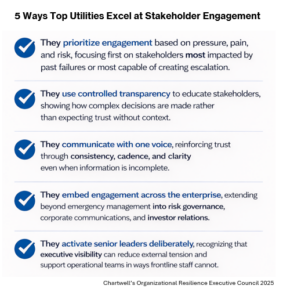 Recent discussions within Chartwell’s Organizational Resilience Executive Council (OREC) underscore a clear reality: external stakeholder engagement is not a courtesy function or a communications add-on. It is a core resilience capability that directly influences restoration speed, regulatory outcomes, investor confidence, and public trust. Utilities that treat engagement as secondary often discover its importance too late, when decisions slow, friction rises, and reputational risk escalates.