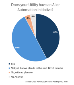 Artificial intelligence and automation are moving from “interesting pilot” to everyday utility operations. In Chartwell’s Customer Experience Leadership Council’s recent March meeting, participants shared a telling snapshot: 42% of council members said they’re already using AI in some capacity, and about half are considering implementation within the next 18 months. That’s a noticeable shift from late 2024, when about half reported they were not using AI at all.